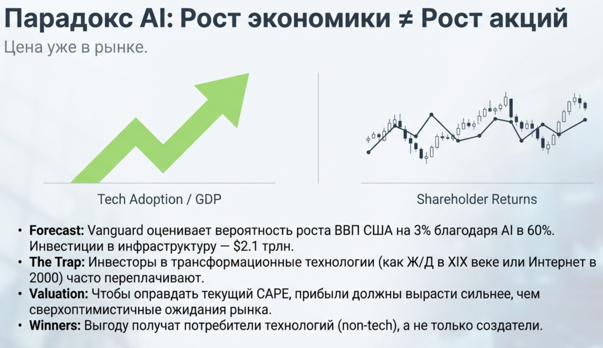 Название отчёта Vanguard — «AI exuberance: Economic upside, stock market downside» — содержит парадокс, который стоит разобрать подробно.