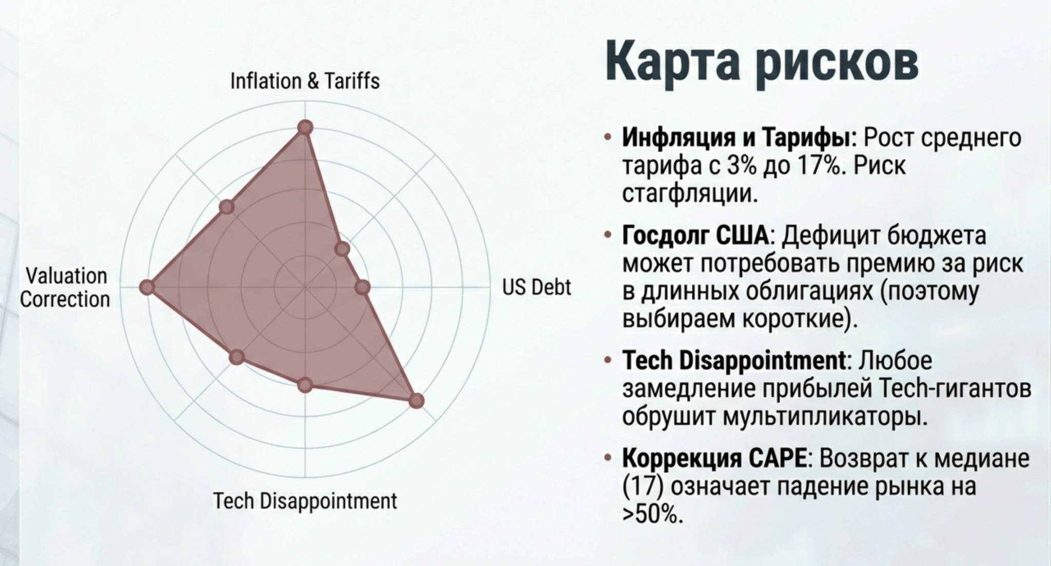 Главный риск — коррекция мультипликаторов к историческому среднему. Если CAPE вернётся с 40 к медианным 17, это подразумевает падение рынка более чем на 50% (при прочих равных). Разумеется, такой сценарий маловероятен в краткосрочной перспективе, но на десятилетнем горизонте возврат к средним значениям — скорее норма, чем исключение.