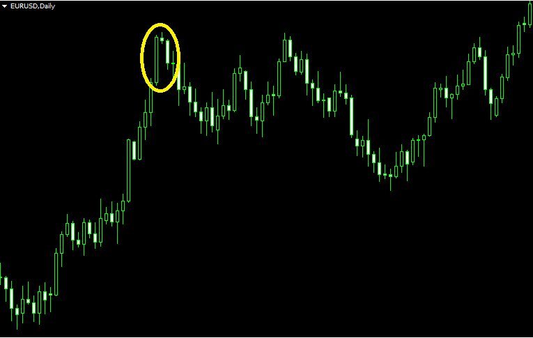 - Первая свеча в этой комбинации показывает уверенный рост. Это может быть как последняя из нескольких подобных свечей, так и просто одна после последней коррекции в рамках восходящего тренда. Для свечи характерно большое тело и маленькие тени.