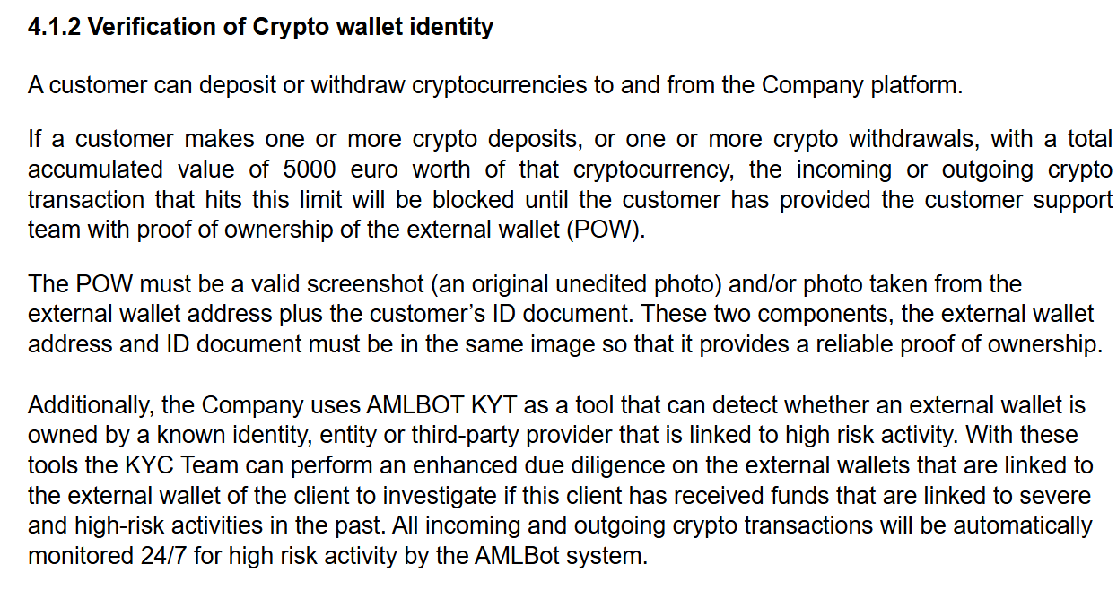 - Если клиент использует криптокошелек для пополнения счета, то при достижении порога в 5000 евро транзакция, на которой превышен этот лимит, блокируется. Понадобится дополнительная верификация криптокошелька. Клиент обязан предоставить брокеру скриншот/фотографию, на котором виден адрес внешнего кошелька и документ, удостоверяющий личность.