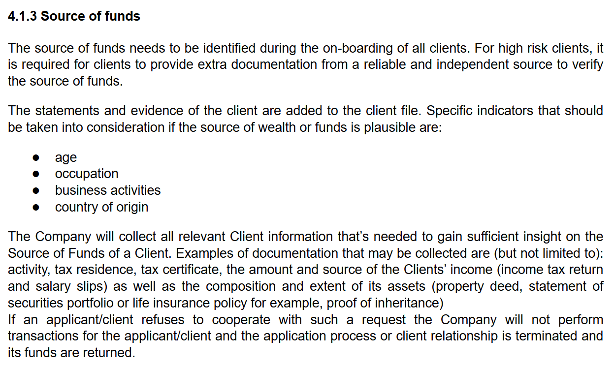 - Клиенты, которым присвоен высокий уровень риска, могут столкнуться с требованием указать источник происхождения средств. Брокер не указывает точную процедуру определения уровня риска, но отмечает, что при этом учитываются возраст, род занятий, страна происхождения, профессия, размер депозита. Компания может затребовать любые документы, связанные с подтверждением источника происхождения средства – налоговые декларации, страховые полисы, выписки о составе инвестпортфеля (если открыты счета у обычных брокеров), документы, подтверждающие получение наследства и другие.