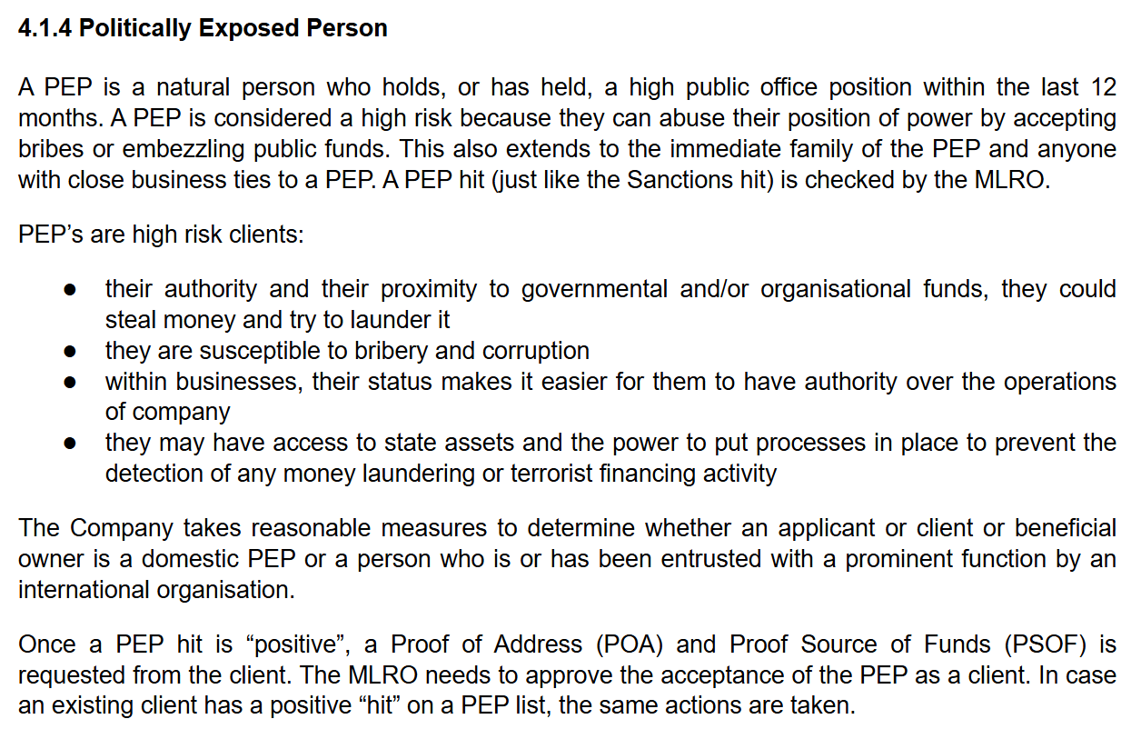 - Политически значимые лица. Так называются лица, занимающие высокий пост, либо занимавшее его в течение последних 12 месяцев. Если компания подозревает, что клиент может быть политически значимым лицом, то она затребует подтверждение адреса, источника происхождения средств.
