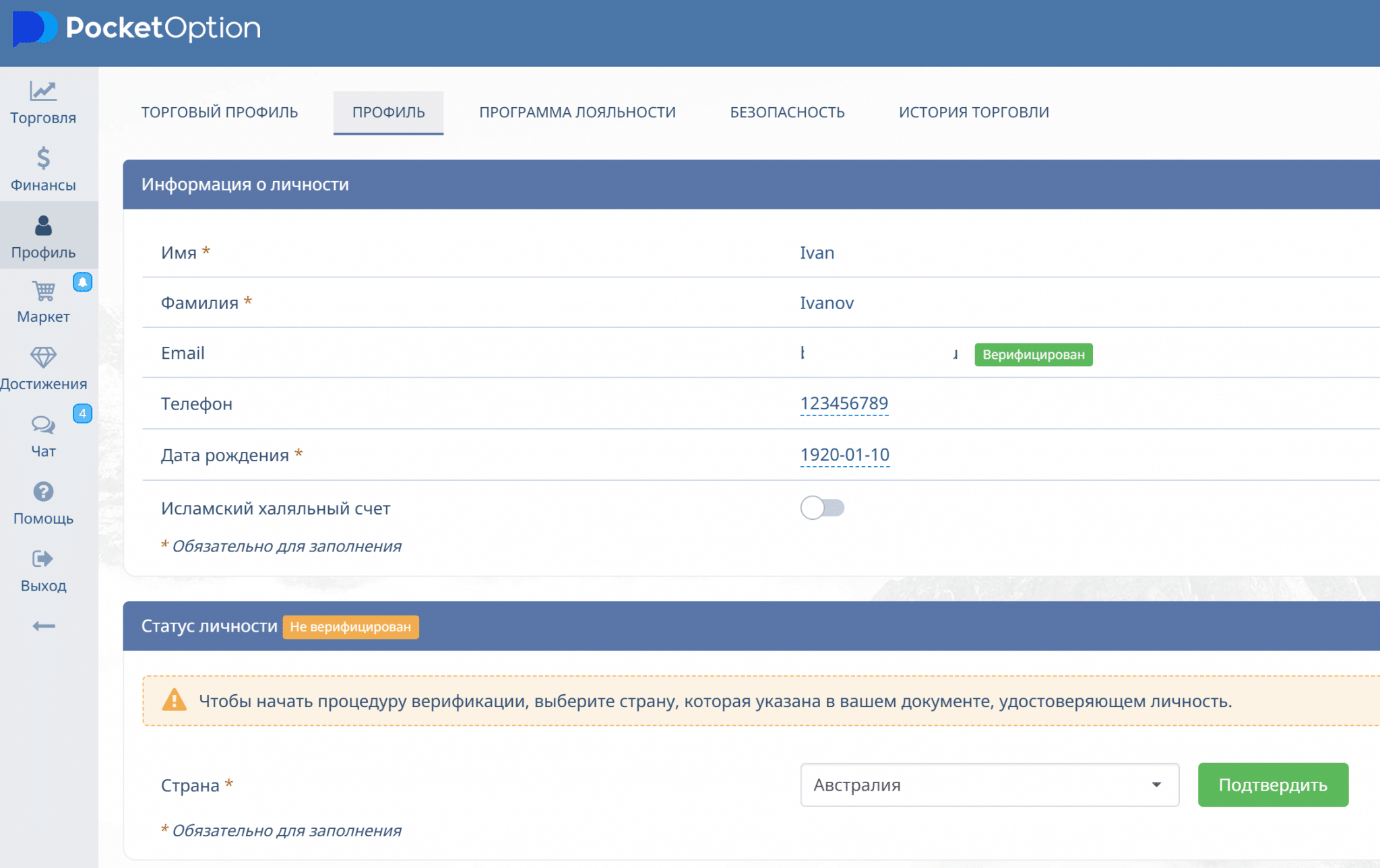 Алгоритм подачи документов отличается в зависимости от брокера. Например, у Pocket Option это можно сделать через личный кабинет: