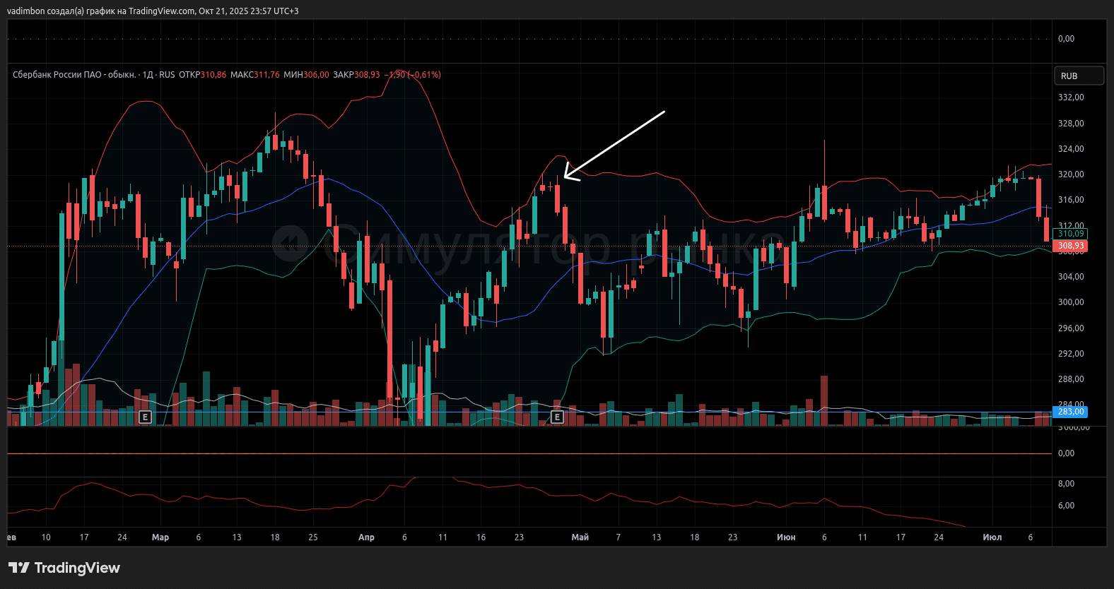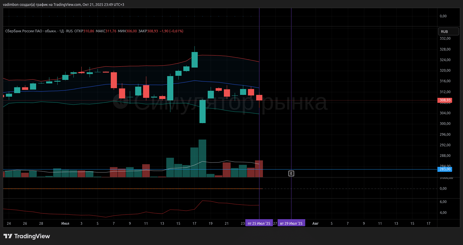 Предыдущий отчёт (первый квартал 2025 года): прибыль составила 436,1 миллиарда рублей; после публикации акции упали на 1.5% в день, а ATR находился в районе 7 рублей. При этом котировки находились у верхней полосы Болинджера.
