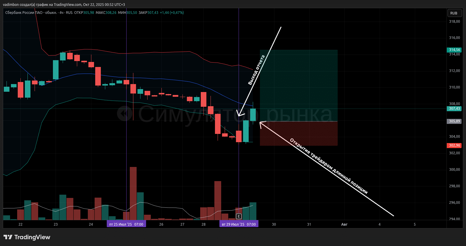 1. В 17:00, после стабилизации на 305.9 ₽ и спада эйфории, он открыл длинную позицию, рассчитывая на продолжение роста.