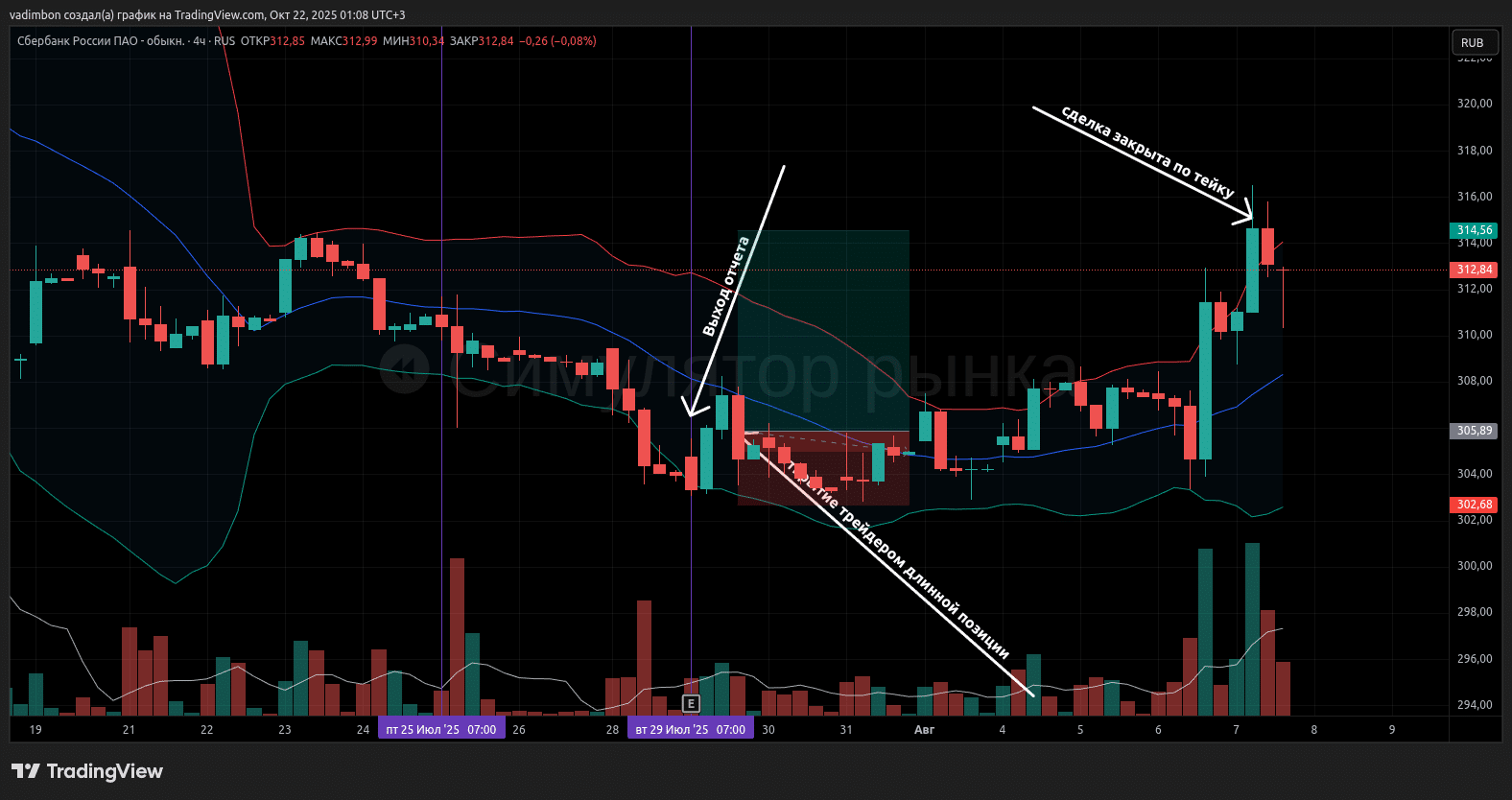 4. Через пару дней цена, простояв в боковике, выскочила на уровень 315. ₽, и сделка закрылась по тейк профиту.