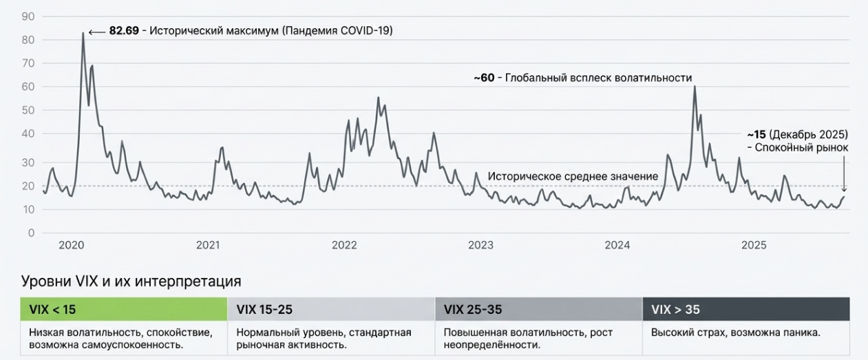 • Точек входа: Когда индекс VIX превышает 30–40 (уровень повышенной паники на рынке), это часто сигнал к покупке качественных активов по сниженным ценам.