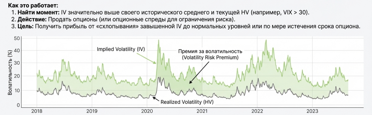 Простейшая стратегия извлечения премии за волатильность — продажа опционов в периоды высокой implied volatility. Когда IV значительно превышает историческую волатильность, премии опционов завышены. Продавая такие опционы и дожидаясь, пока IV нормализуется или опцион истечёт без денег, трейдер получает прибыль от переоценки волатильности рынком.