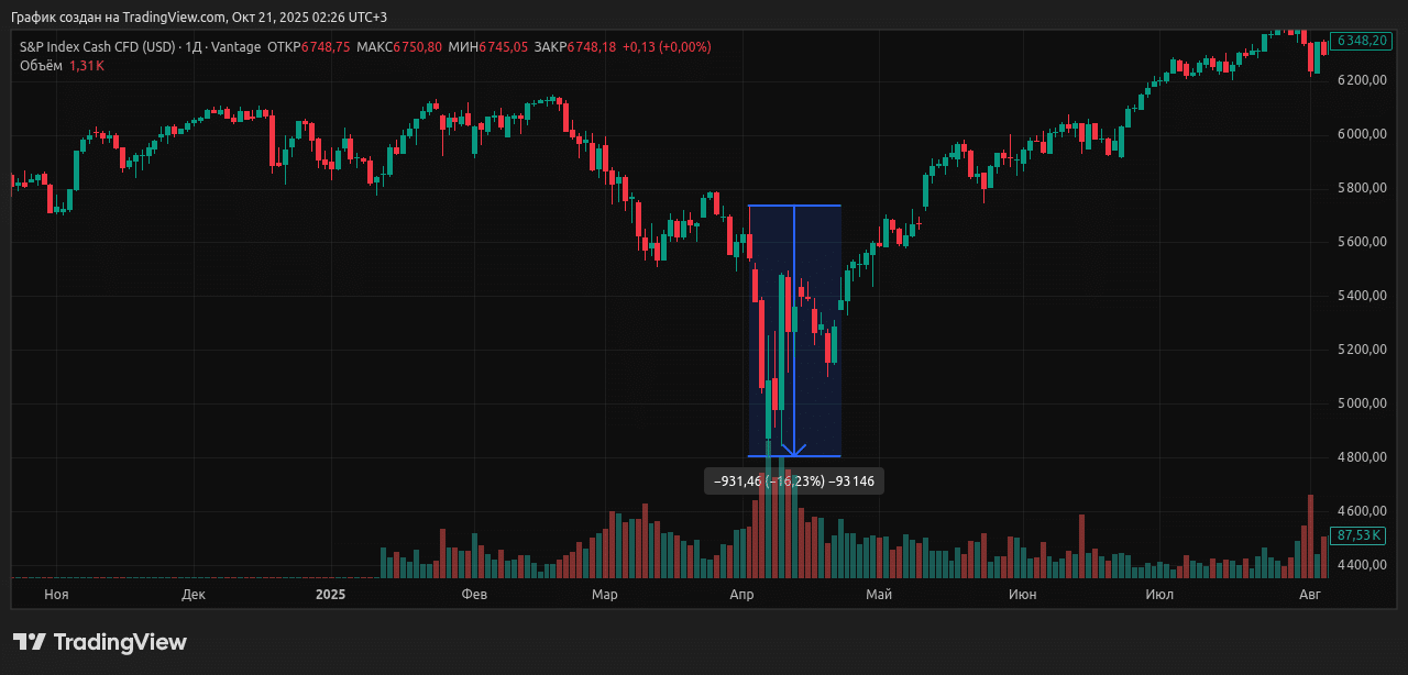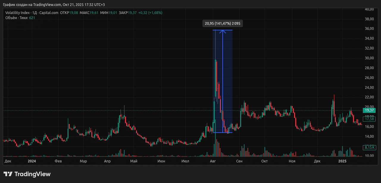 В августе 2024 года на фоне глобальных экономических опасений и распродаж VIX подскочил примерно на 141% (с 14 до 35 пунктов в пике), а S&P 500 потерял около 6-8% за первые дни месяца, хотя позже восстановился. Аналогичный сценарий развернулся в апреле 2025 года из-за тарифных угроз: VIX вырос более чем на 90% (до 36 пунктов).