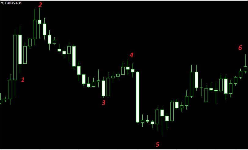 Чтобы было проще найти, а, вернее, опознать волны Вульфа на стадии формирования, следует рассматривать только те случаи, когда цена движется достаточно динамично и рисует быстрые развороты. То есть чётко видимая структура движений значительно упростит идентификацию. Если же экстремумы состоят из нескольких подходов к одному и то же уровню, как показано на примере ниже, то искать волны Вульфа будет достаточно сложно, при этом может пострадать графическое построение, примерно как с трендовыми линиями – нечёткий разворот оставляет неопределённость по поводу опорной точки.