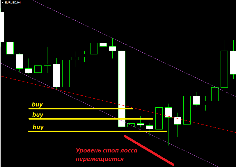 То есть, например, через каждые 5 или 10 пунктов – тут всё зависит от масштаба и тайм фрейма, на котором она образовалась. Как правило, цена достигает канала, поэтому позицию можно начинать наращивать где-то с середины текущего диапазона свит-зоны. Поскольку движение 2-3-4, как уже было сказано, как правило простой зигзаг в коррекции, то канальная структура очень часто срабатывает именно так, то есть с касанием канала, после чего начинается разворот. Стоп, соответственно, выносим за пределы свит-зоны, с запасом.