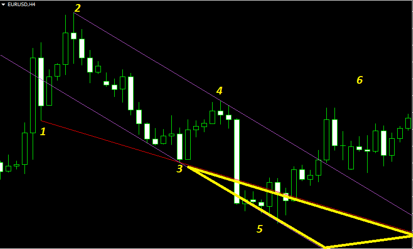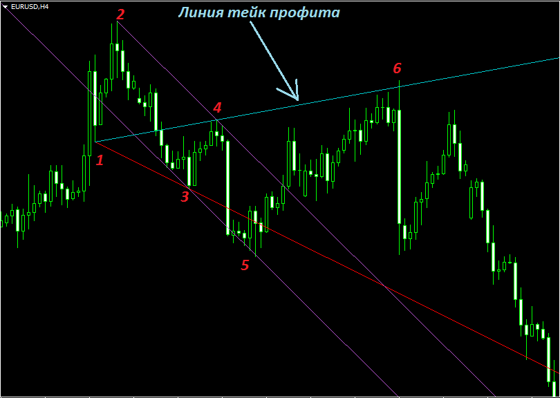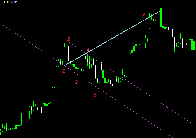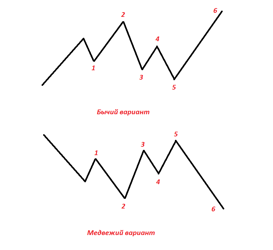 Эта простейшая схема описывает весь паттерн как для медвежьего, так и для бычьего варианта. В общем, у нас получается три экстремума – точки 1, 3 и 5, которые формируют основную конструкцию, по ним легко определяется сам паттерн. Из методов Price Action мы знаем, что линия, проведённая по экстремумам, служит хорошим ориентиром для движения цены, она очень часто выступает как поддержка или сопротивление.