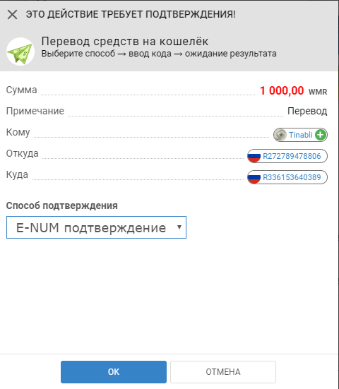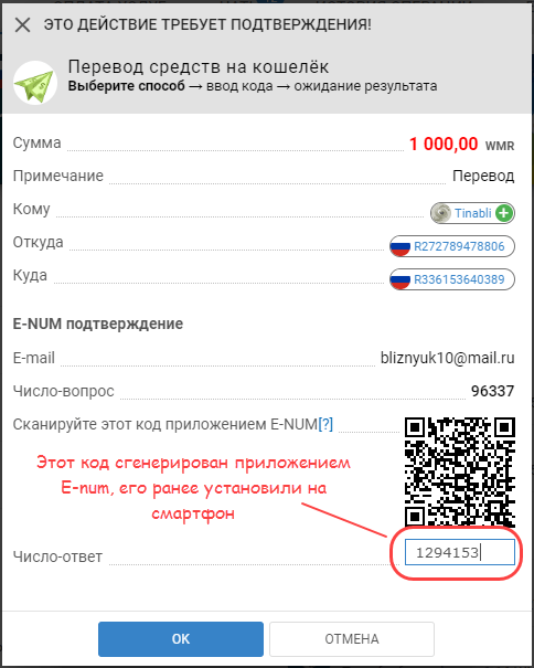 Для повышения комфорта работы с Вебмани кошельками рекомендуем использовать сервис авторизации E—num. После регистрации в нем вам не нужно будет терять время на получение СМС, чтобы подтвердить перевод денег. Достаточно сканировать QR код, получить дешифрованный код и ввести его в соответствующее поле. Как вариант – вручную вводите в приложении от E—num число-вопрос и получаете число-ответ.