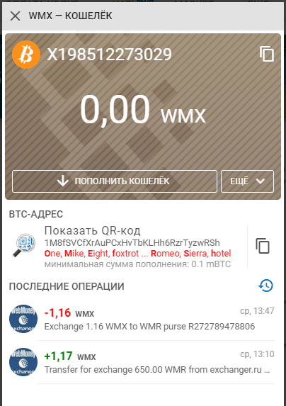 В системе вводятся специальные титульные знаки, соответствующий 0,001 токена соответствующей крипты. Так, 1 WMX соответствует 0,001 ВТС, 1 WMH – 0,001 BCH и 1 WML – 0,001 LTC. Общий вид биткоин кошелька показан ниже.