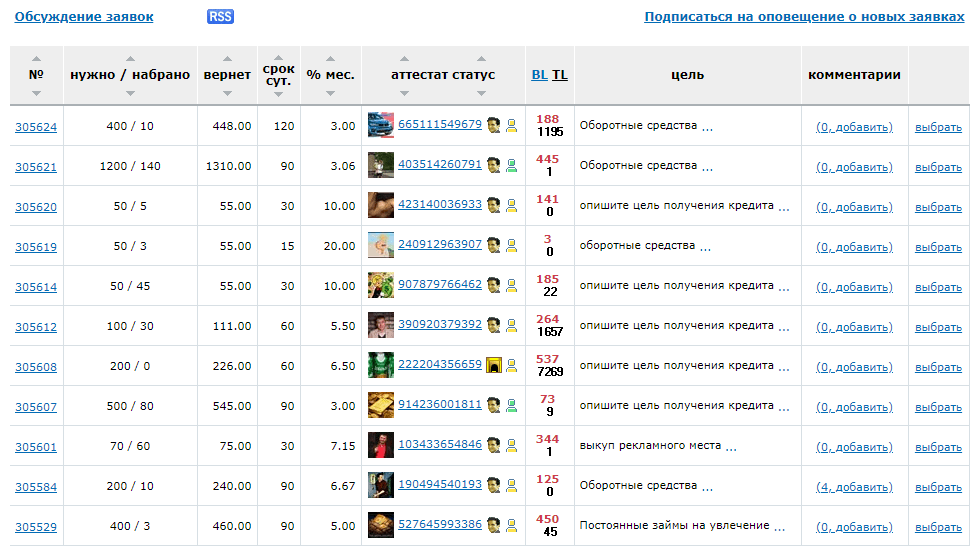 Что касается самого принципа работы кредитной биржи, то заемщики публикуют объявления, в которых указывают на какой срок им нужны деньги, какой месячный процент их устроит, указывается и цель кредитования. Обычно пишут либо «оборотные средства», либо «развитие бизнеса». Суммы чаще всего фигурируют небольшие.