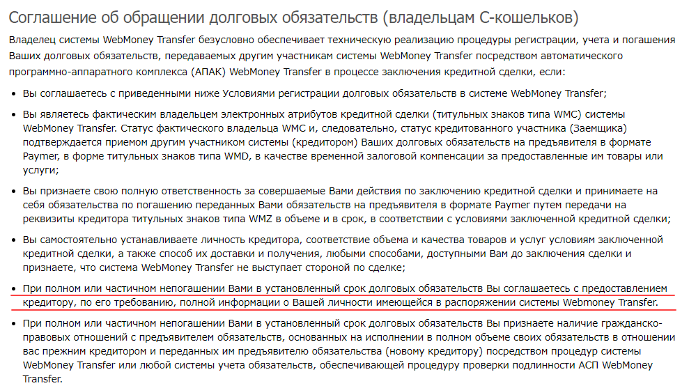 Из недостатка этого метода заработка отметим вероятность столкнуться с мошенниками. Если займ вам не отдадут, то ЭПС компенсировать убыток не будет. Вместо этого на WMID заемщика накладываются санкции – кошельки блокируются. В документации указано, что при частичном или полном непогашении задолженности заемщик автоматически соглашается с тем, что его личная информация может быть передана кредитору.