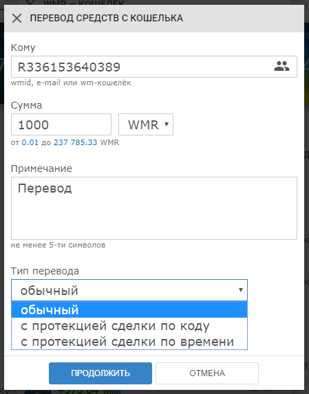Кнопка перевести - в следующем окне задаем адрес, на который уйдут деньги, сумму перевода, обязательно указывается примечание. В окне тип выбирается один из 3 вариантов: обычный – без подтверждения перевода, с протекцией по коду – вы получите код, затем скажете его отправителю и только после ввода кода тот получит перевод, с протекцией по времени – деньги автоматически зачислятся на счет получателя через определенный срок;