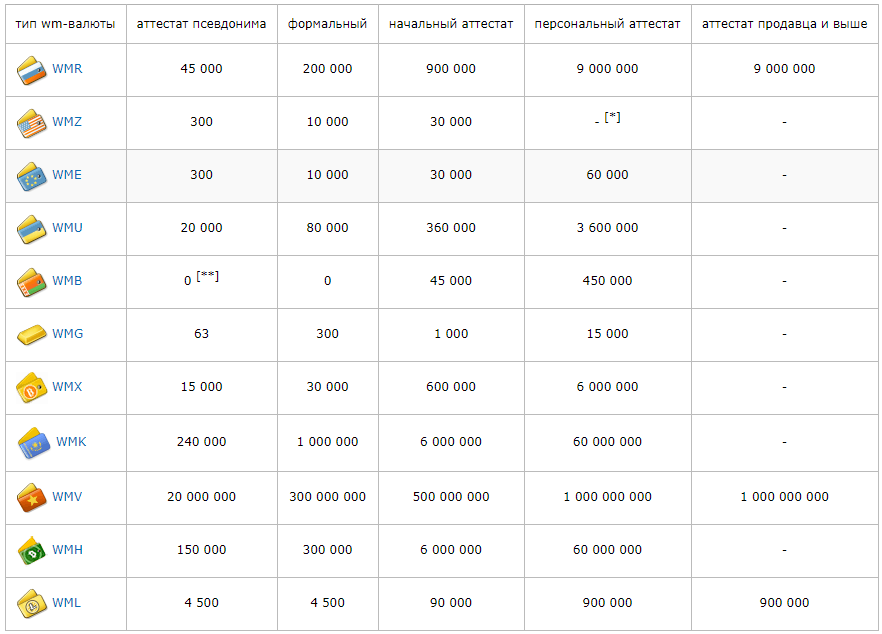 Уровень ваших возможностей (максимальная сумма, хранимая на счетах, лимиты при переводах) зависит от аттестата. На рисунке ниже – ограничения по максимальной хранимой сумме в зависимости от вашего уровня в системе.