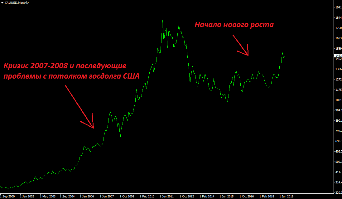 2. Золото. Исторически сложилось так, что люди больше всего доверяют тому, что имеет конкретную ценность. С деньгами было также до тех пор, пока не упразднили золотой стандарт. Теперь деньги – просто бумага. Золото же, как защитный актив инвестора, пользуется значительным спросом в периоды нестабильности. Это может быть маленький, локальный военный конфликт, а может быть финансовый апокалипсис – золото всегда реагирует. Если посмотреть на цену золота в периоды нестабильности и финансовых потрясений, то можно отметить рост в каждый из таких моментов. Движения обычно достаточно значительные, поэтому у инвестора в случае кризиса будет достаточно времени для того, чтобы спокойно постепенно реализовать купленное золото.