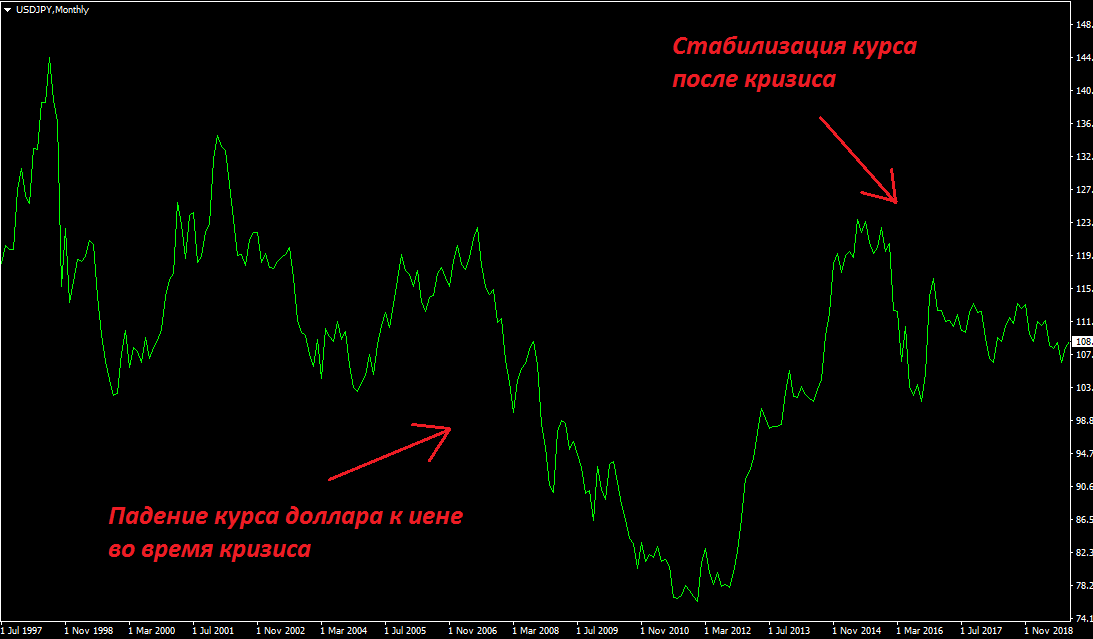 Возникает закономерный вопрос – а что делать, если вдруг центробанк страны примет решение ослабить франк и удерживать его на определённой отметке, как это уже было в прошлом? К сожалению, такое не предугадать. Они внезапно привязали франк к евро, а затем столь же внезапно его отвязали. На рынке была масштабная неразбериха. Поэтому франк подходит для тех, кто рассматривает долгосрочное вложение, то есть до того времени, когда не исчезнут отголоски кризиса. Кому-то такой риск покажется неоправданным, соответственно, можно присмотреться к тому же доллару, его вряд ли можно легко сдвинуть на 10%. Но стоит помнить – в кризис доллар падает по отношению к франку, то есть франк более “защитный”. - Японская иена. Ещё один исторический пример хорошей экспортной экономики, страны с развитыми технологиями и значительными финансовыми ресурсами. Есть, правда, относительно большой долг, но при этом Япония держит американских облигаций на более, чем 1 триллион долларов. Иена пользуется таким же спросом, как и франк. И центробанк страны также боролся с укреплением курса валюты по отношению к доллару. Были приняты масштабные меры, которые привели к значительному ослаблению валюты в период, когда рынки находились в стадии сильного роста. На данный момент мы имеем нейтральную картину, что делает иену привлекательной для покупок в случае ухудшению ситуации в мире.