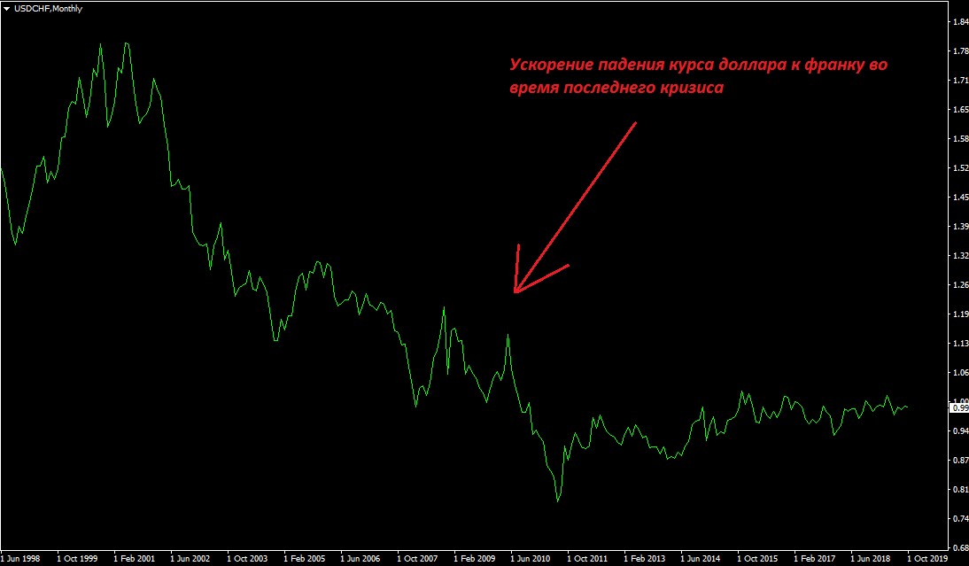 Но есть и другая сторона медали. Крепкий доллар не интересен самим США, поэтому на его курс могут в дальнейшем воздействовать. Другое дело, что это не будет иметь очень серьёзных последствий в том случае, если действительно на рынке разразится новый масштабный кризис, так как в доллар потекут триллионы. Ну и не забываем об американском государственном долге, тоже вопрос в состоянии перманентного напряжения. Тем не менее, американский доллар вполне можно рассматривать как защитный актив инвестора в кризис. Дальше у нас идёт менее популярный вариант, но более интересный с точки зрения дохода. - Швейцарский франк. Очень популярная валюта, которая является прекрасным защитным активом в кризис. Экономика этой страны стабильна, да и сама страна – одна из наиболее благополучных. В связи с этим франк скупают, когда появляется неопределённость. При чём скупают даже не с целью спекуляции, а с целью сохранить свои активы, защитить капитал. Любопытно то, что страна много лет борется с укреплением курса национальной валюты, проводя интервенции, снижая ставки и так далее. Но практически не уменьшает объёма интереса к франку, о чём свидетельствуют постоянно растущие валютные резервы Национального Банка Швейцарии. В общем, покупали, покупают и будут покупать, надёжность валюты вне всяких сомнений.