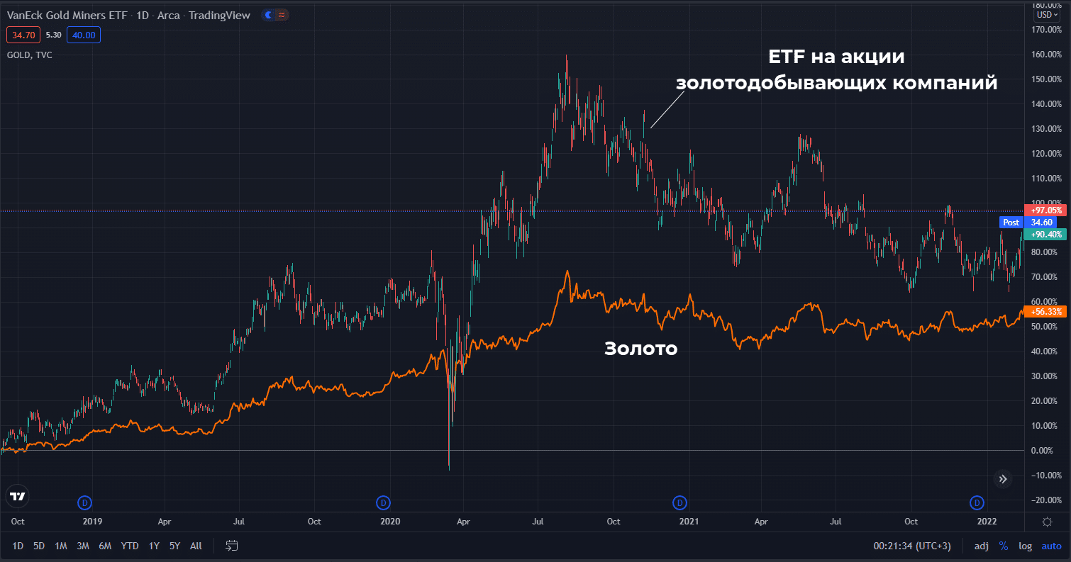 - VanEck Gold Miners (GDX). В управлении более $14 млрд, запущен 16 мая 2006 г., копирует индекс NYSE Arca Gold Miners. За управление провайдер берет 0,52% в год. Ориентирован на крупнейшие золотодобывающие компании мира.