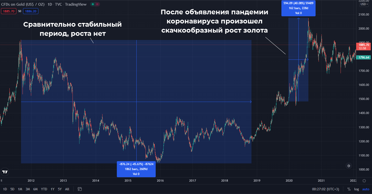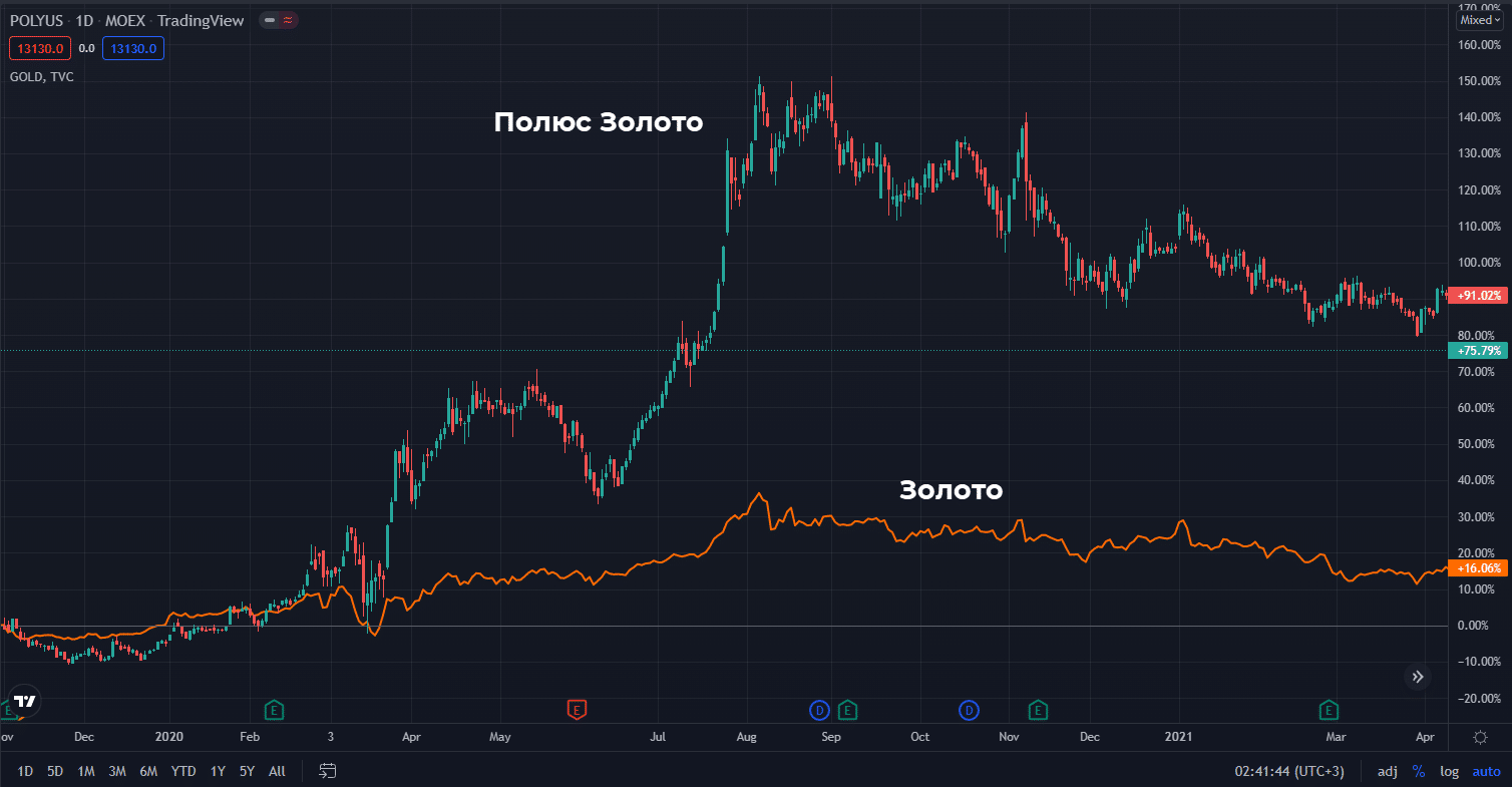 Но это лишь общая картина. На отдельных участках истории бумаги компаний сильно обгоняли рост золота. Например, в 2020 г. меньше чем за полгода акции Полюс Золото выросли больше чем на 100%. Пара XAUUSD на этом же временном отрезке выглядела явным аутсайдером.