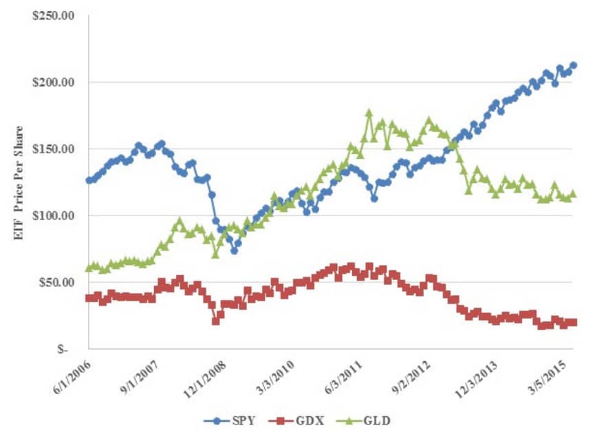 К такому же выводу приходят и другие исследователи. В работе Марка Джонсона и Дугласа Ламдина сравнивались GLD (фонд с привязкой к металлу), SPY (еще один ETF, но на S&P 500) и биржевой фонд GDX – выбран в роли бенчмарка для золотодобытчиков.